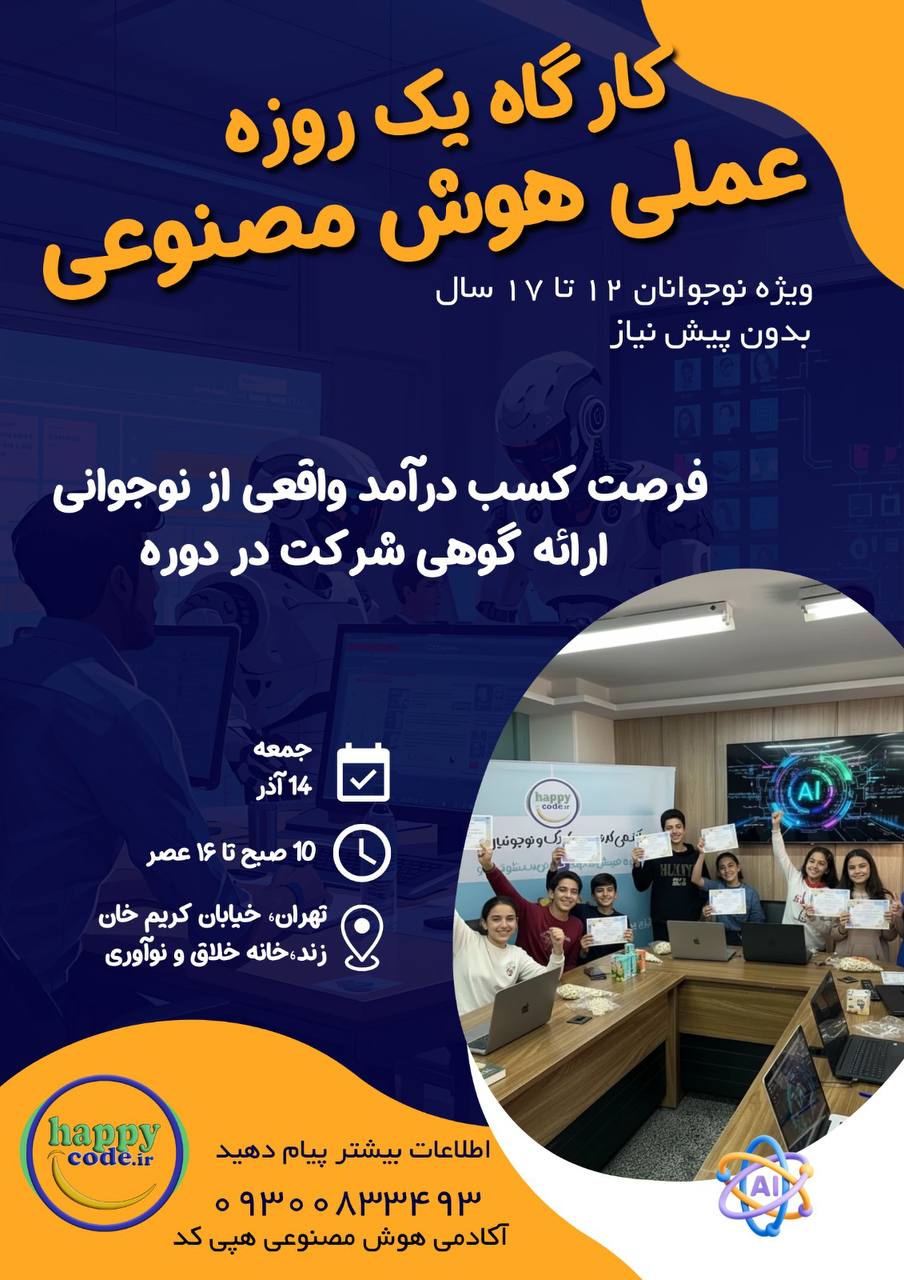 عی برای نوجوانان کارگاه هوش مصنوعی نوجوانان هپی‌کُد یک دوره یک‌روزه ۶ ساعته حضوری است که با رویکرد کاملاً پروژه‌محور طراحی شده است. هدف این کارگاه این است که نوجوانان بتوانند با ج …
